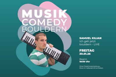Bekannt durch „Ich geh jetzt bouldern“: Samuel Kilian spielt sein preisgekröntes Musik-Comedy-Programm bei uns in der Halle – 3 Sets, Eintritt inklusive. Sei dabei!